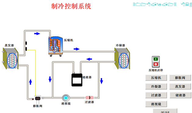 5、工作流程圖板3套:工作流程圖板詳細(xì)說明制冷系統(tǒng)流程、監(jiān)測點(diǎn)溫度、系統(tǒng)壓力、工作狀態(tài)指示、系統(tǒng)部件說明。