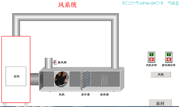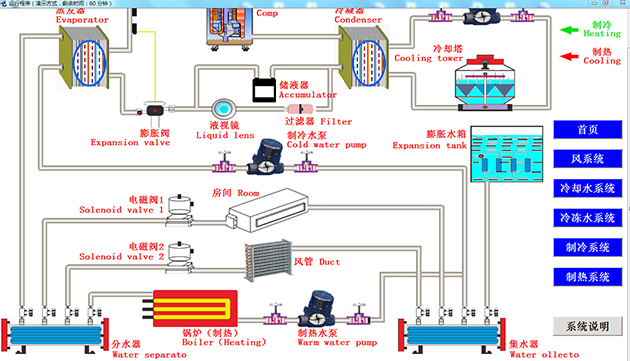 (3),系統(tǒng)故障運(yùn)行演示:在配置有實(shí)物中央空調(diào)實(shí)訓(xùn)考核裝置時,在軟件演示故障時系統(tǒng)動畫與實(shí)物實(shí)時故障同步,讓學(xué)生更好地?fù)挝湛照{(diào)原理、操作方法,如壓縮機(jī)系統(tǒng)、制冷系統(tǒng)、制熱系統(tǒng)、風(fēng)系統(tǒng)、集中送風(fēng)系統(tǒng)、半集中送風(fēng)系統(tǒng)的原理過程。