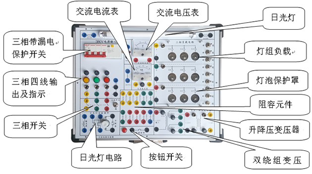 4、配三相燈組負(fù)載:每相有三個15W燈泡,用3只開關(guān)控制通斷,共9只燈泡。每相留有電流測量插孔1對,便于相電流的測量。