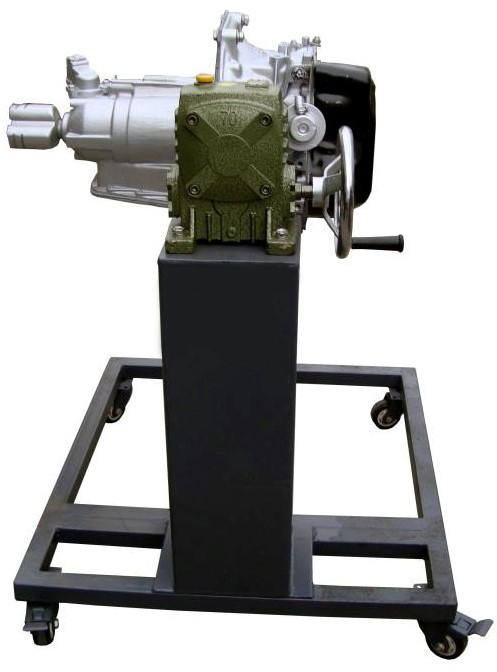 采用減速翻轉(zhuǎn)機構(gòu),可使變速器旋轉(zhuǎn)任意角度,并能任意位置鎖止,便于學生從不同的角度進行拆卸和裝配。
