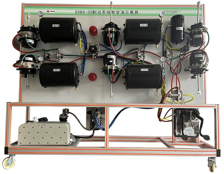 1.臺架上具有的全新東風(fēng)天錦原車零部件有空氣壓縮機總成、空氣干燥劑、前橋儲氣筒、后橋儲氣筒、手制動儲氣筒、再生儲氣筒、輔助儲氣筒、四回路保護閥、制動腳閥、駐車閥、繼動閥、制動管路、氣壓表若干個。