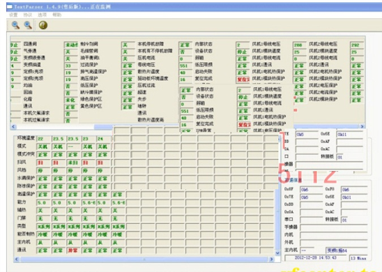 我公司生產(chǎn)的中央空調(diào)設(shè)備由廠家提供了中央空調(diào)測(cè)試維修控制程序軟件;能夠準(zhǔn)確地快速確定故障發(fā)生在哪個(gè)機(jī)組,軟件同時(shí)我顯示空調(diào)100多個(gè)在線數(shù)據(jù)和運(yùn)行狀態(tài),據(jù)不同的機(jī)型有不同的界面,具體為:1拖16(EVI)、1拖32、數(shù)碼模塊化1拖64、變頻模塊化1拖64、熱回收、單機(jī)直流變頻、單機(jī)交流變頻、智能變頻、單機(jī)420、單機(jī)900、模塊式風(fēng)冷螺桿等所有中央空調(diào)機(jī)。