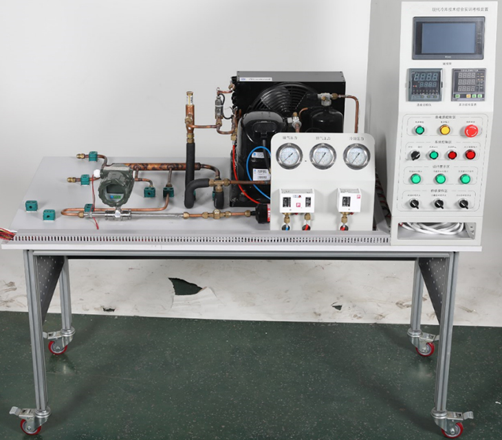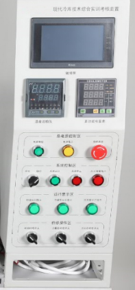 3、開(kāi)放性。該設(shè)備設(shè)置了一個(gè)系統(tǒng)操作臺(tái),在庫(kù)體一側(cè)安裝有可更換側(cè)板,以便于學(xué)員在上述的操作臺(tái)與側(cè)板上安裝制冷系統(tǒng)和電路系統(tǒng)等。