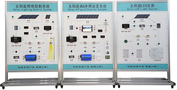 光伏發(fā)電系統(tǒng)集成演示版,主要由A、B、C三塊主模板組成。A 太陽能照明控制系統(tǒng)演示模板、B 太陽能離&并網(wǎng)逆變系統(tǒng)演示模板、C 太陽能LED光源系統(tǒng)演示模板。