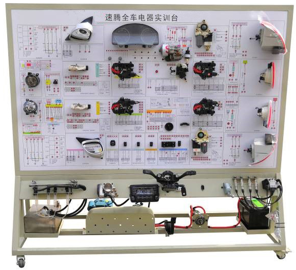 該設(shè)備采用 全新 大眾速騰1.6L  整車電器實(shí)物為基礎(chǔ),充分展示汽車發(fā)動(dòng)機(jī)防盜系統(tǒng)、儀表系統(tǒng)、燈光系統(tǒng)、雨刮系統(tǒng)、喇叭系統(tǒng)、點(diǎn)火系統(tǒng)、電動(dòng)車窗系統(tǒng)、電動(dòng)門鎖、音響系統(tǒng)、起動(dòng)系統(tǒng)和充電系統(tǒng)等汽車電器各系統(tǒng)的組成結(jié)構(gòu)和工作過(guò)程。