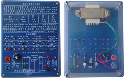 底盒使用190mm×145mm的開模有機(jī)透明塑料底盒,模塊面板采用印制電路板PCB工藝,可以直觀看到器件的實(shí)物及相關(guān)的原理介紹。對(duì)于易損器件安裝在面板背面,透過透明底盒能夠看到器件實(shí)物,方便感性認(rèn)識(shí)、檢測(cè)測(cè)試,同時(shí)也能防止器件的損傷。